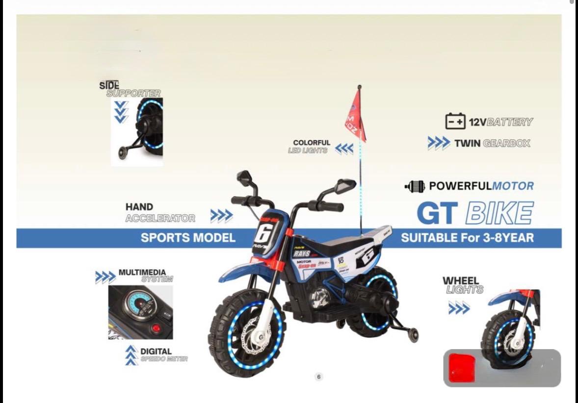 The GT Bike Sports Model is built for adventurous kids who enjoy speed and style. With a 12V battery, hand accelerator, twin gearbox, and wheel lights, this bike delivers a thrilling yet safe riding experience.