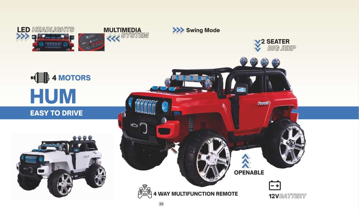 The HUM electric jeep features a bold design with chrome wheels, LED headlights, swing mode, openable doors, and 4-motor power.