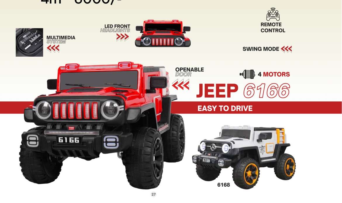 The Jeep 6166 offers a strong body, 4-motor performance, LED headlights, swing mode, and openable doors. Perfect for kids who love off-road style rides.