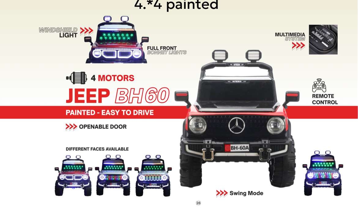 Jeep BH60 comes with a bold front look, full bonnet LED lights, swing mode, and 4-motor power. Designed for easy driving with parental remote control support.