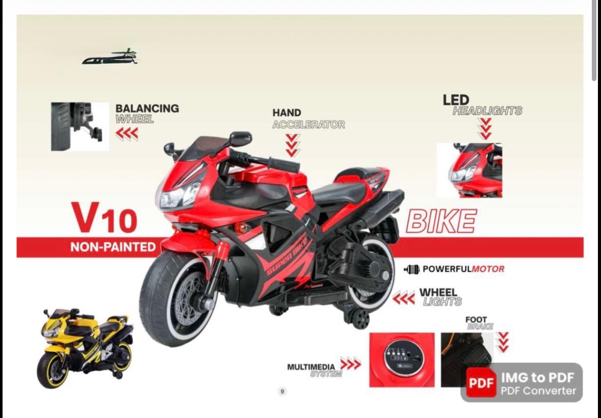 The V10 Non-Painted Bike offers a sporty look with durable build quality. Equipped with balancing wheels, LED lights, and a foot brake, it ensures safety along with style.