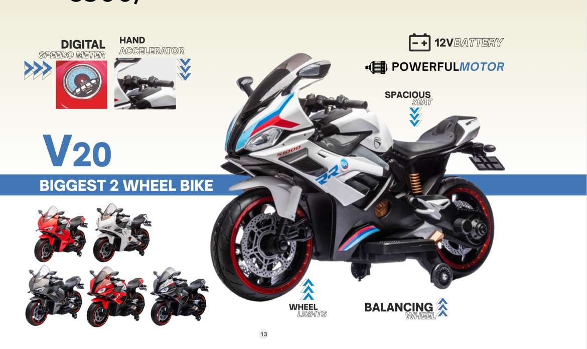 Designed for older kids, the V20 offers a bold racing design, spacious seating, LED wheel lights, hand accelerator, and balancing wheels for controlled riding.